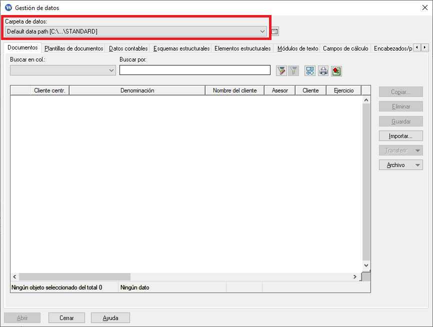 DATEV Audit guarda información de cada encargo en dos carpetas especiales de acuerdo al tipo de datos. Para visualizar las rutas de datos a las que el usuario tiene acceso, debe ingresar al menú FICHERO > OPCIONES > CARPETA DE DATOS: En la primera ...