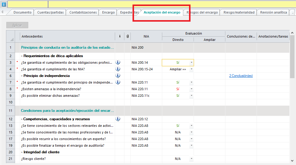 En DATEV Audit, existe una sección dedicada a este tema en donde se ofrece un cuestionario completo, soportado por las diferentes normas a la que el auditor puede recurrir para información adicional. Para acceder a la pestaña de aceptación del encargo de auditoría se debe tener abierto cualquier documento del cliente en cuestión. Eso nos permitirá, acceder a la pestaña "Aceptación del encargo" como se muestra a continuación: